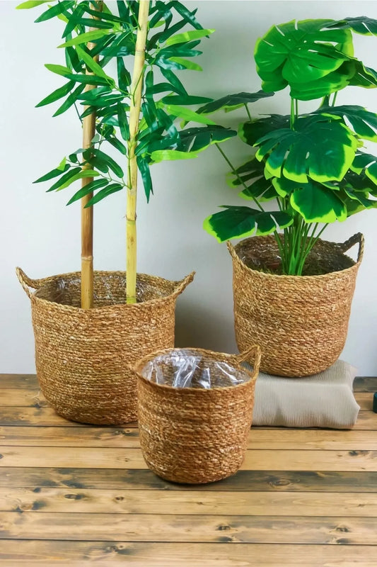 Dekoratif Doğal El Örmesi Kulplu Hasır 3 Lü Saksı Sepet Seti
