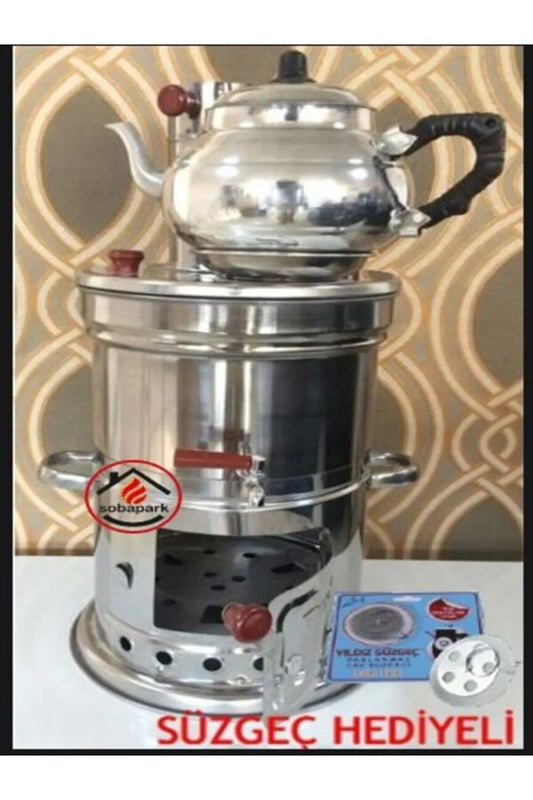 Tek Musluklu Paslanmaz Krom Odunlu Semaver 4 Litre - Demlik 1 Litre (NET)